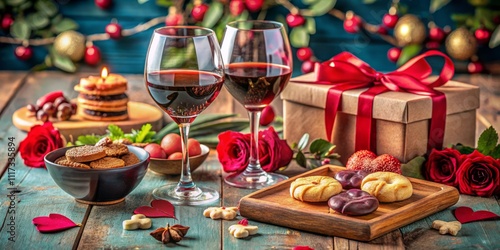 Romantic Valentine's Day Celebration with a Set of Wine, Cookies, and Thoughtful Gifts on a Colorful Background, Perfect for Capturing Love and Togetherness