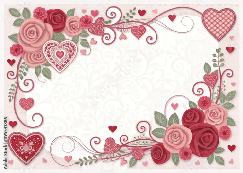 Romantic Valentine's Day Wedding Invitation Template with Elegant Red Rose Frame, Hearts Border Background Design