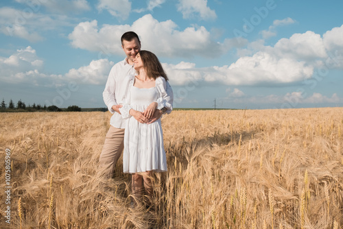 Romantic young couple standing in wheat field,Man and woman in wheat two