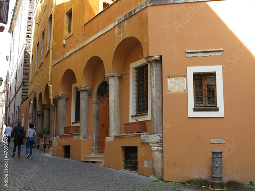 Rome Street View with Historic Orange House Facade with Ancient Columns, Italy