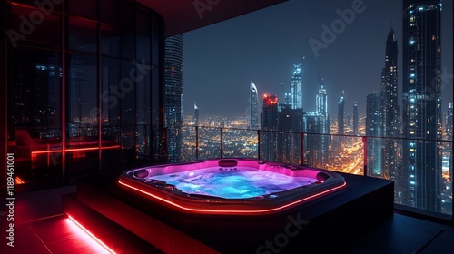Rooftop hot tub with city skyline at night.
