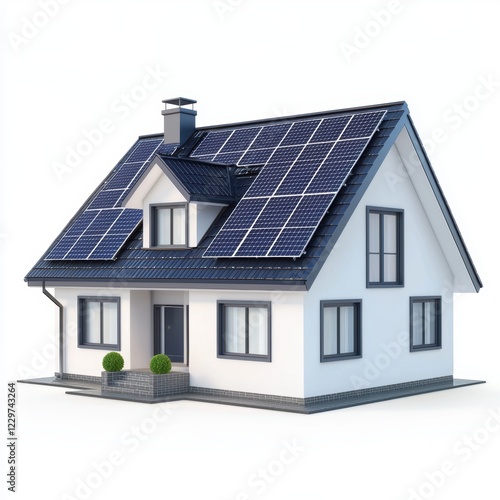 rooftop solar panel installation on a modern house, isolated on a clean white background