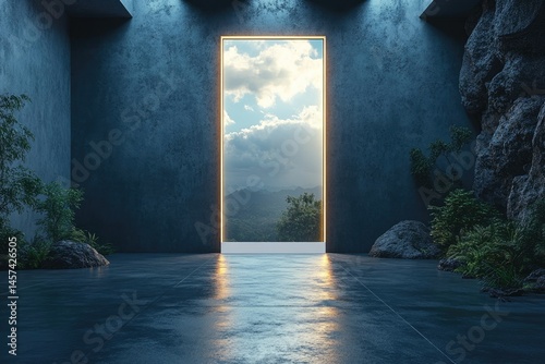 Room, Doorway, Landscape, Mountains, Sunset, Concrete, Plants, Escape