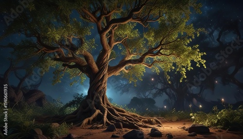 Roots and branches intertwined with vines and foliage under a canopy of stars, branches, tree, tree branches