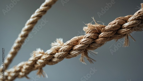 Rope showing signs of wear, nearing rupture in the background. Selective focus