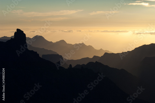 Roque Bentaiga to the left and cliffs of the west of Gran Canaria at sunset. Gran Canaria. Canary Islands. Spain.