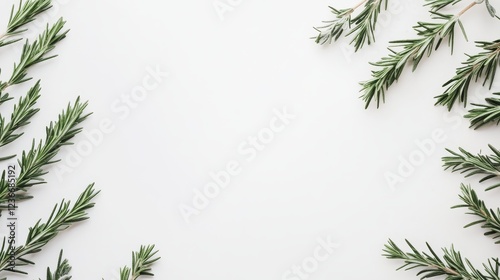 Rosemary twig and leaves isolated on white background. Top view. Flat lay