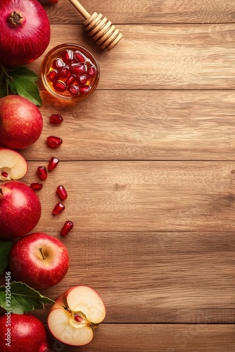 Rosh Hashanah Papercut Art: Vibrant Pomegranate, Apples, and Honey on Wooden Background | Jewish New Year Celebration Image with Ample Text Space | Stock Photo for Festivals and Holidays