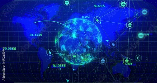 Rotating polygonal globe hovering above world map grid, with price tags and currency icons