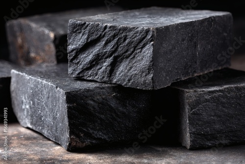 Rough hewn dark gray stone blocks stacked together on a textured surface