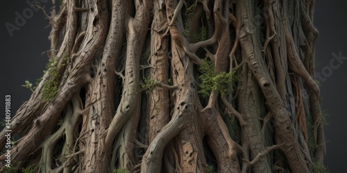 Rough tree bark, intricate root system Deep browns, grays, subtle greens , pattern, earth tones, photography