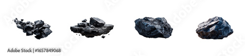 Roughly textured dark mineral fragments floating against a stark black background, cut out transparent
