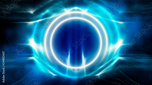 Round abstract tunnel, blue neon. Neon circle light arch, in the center, light, rays, smoke. Abstract blue background with rays and neon.