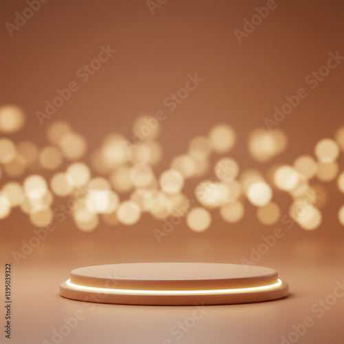 Round beige podium display stand with gold trim against dark background with blurred warm golden bokeh lights effect. Empty festive luxury stage showcase scene.