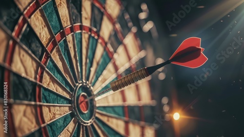 Round dart board with a dart close up. A sports game in which the goal is to throw darts at a target. Get the goal concept, be winner, hobby.