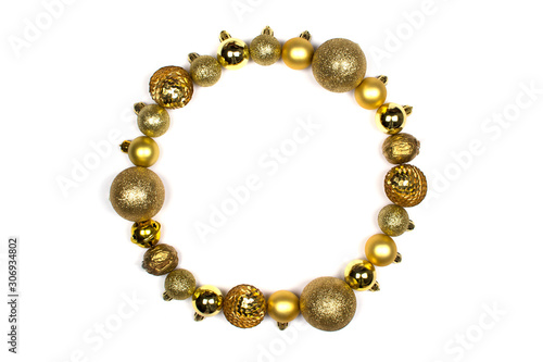 Round frame in form of Christmas wreath of New Year's golden balls. Layout for design flat lay, place for text. Christmas balls of different sizes and textures. Merry Christmas and a happy new year.