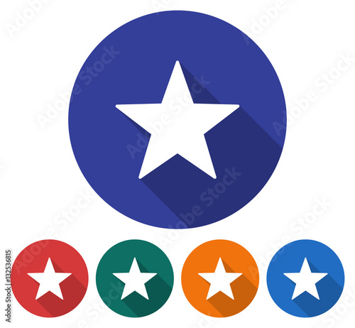 Round icon of star. Flat style illustration with long shadow in five variants background color