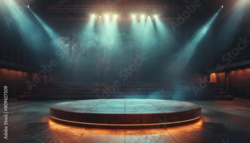 Round podium at a sports arena, suitable for showcasing sports equipment or athletic wear
