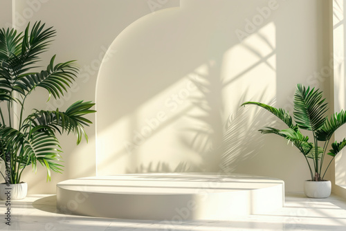 Round podium for product display and palm plant on light background. Trendy neutral aesthetic mockup template for beauty and cosmetics stage