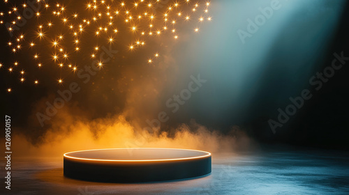 round podium illuminated by soft golden lights, surrounded by mist and stars, creates magical atmosphere