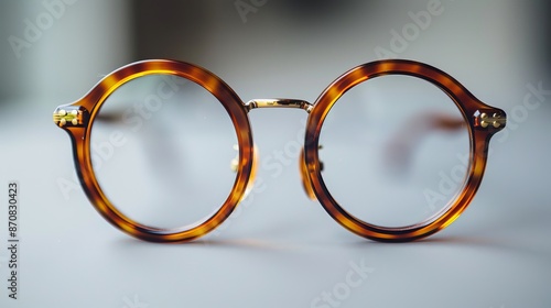 Round tortoiseshell eyeglasses on white background, close-up. Vintage fashion accessories concept