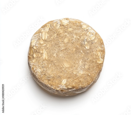 Round, unbaked dough ball, light brown color, flecked with oats. Appears to be a cookie or bread dough, ready for baking