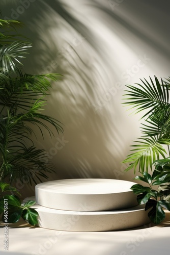 Round white podium on a wall background with tropical leaves, podium mock up for product presentation