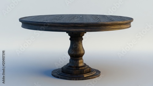 Round wooden dining table with pedestal base on a minimalistic background Copy Space