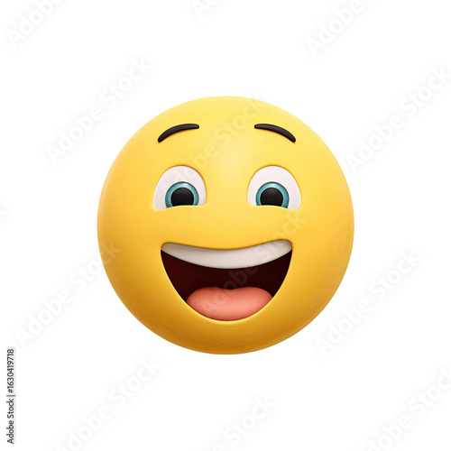 Round yellow emoji face with a wide, happy smile. Large, expressive eyes and a visible mouth. 3D style, clear and cheerful