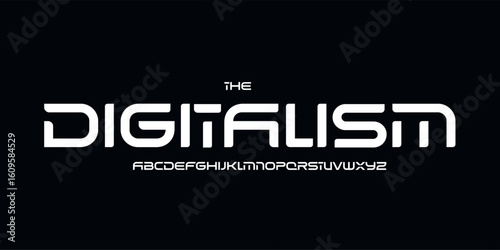 Rounded futuristic logo font, wide sci-fi alphabet. Smooth digital typeface for tech headline, cyber UI, space HUD, music stream display, modern interface, audio branding design. Vector typography