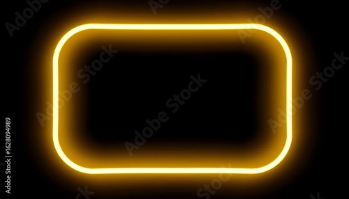Rounded neon yellow square frame glows softly on black background , glowing frame, copy space