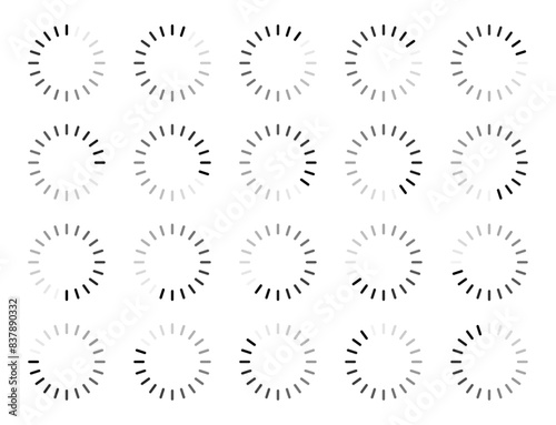 Rounded rectangle loading, buffering, processing, progressing symbols in 20 shades of black colour. Rectangular buffering icon set in twelve shades of black colour isolated on white background.