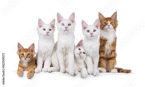 Row of 6 Maine Coon cat kittens, laying and sitting side by side on edge. All looking towards camera with all different eye colors. Isolated on a white background.