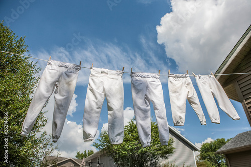 Row of baseball pants hanging up to dry on a clothesline