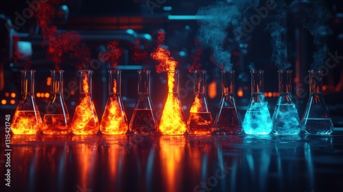 Row of beakers with red and blue bubbling liquids, smoke against dark background