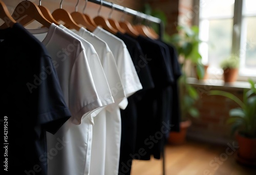 Row of black and white T-shirts hanging on rack, fashion studio lighting, sharp and clean