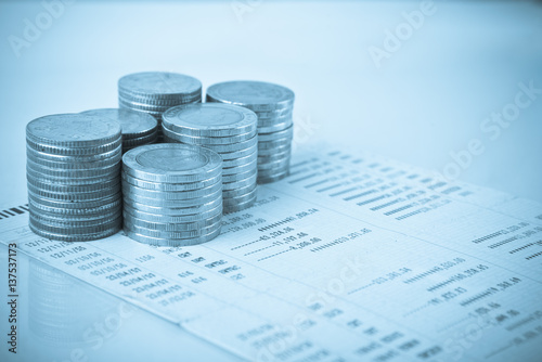 row of coins and account book on the table in banking and finance concept