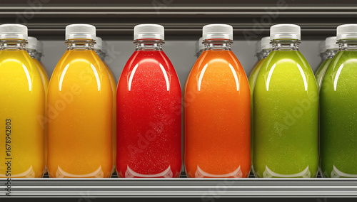 Row of colorful fruit juice bottles in yellow red orange and green on display shelf