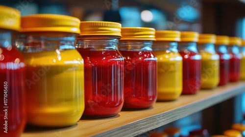 Row of Colorful Jars with Yellow and Red Preserves on Wooden Shelf