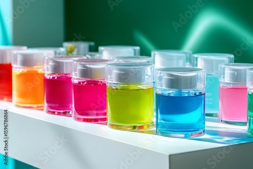 Row of colorful transparent liquid soap dispensers on white shelf against green background, creating a vibrant and appealing display