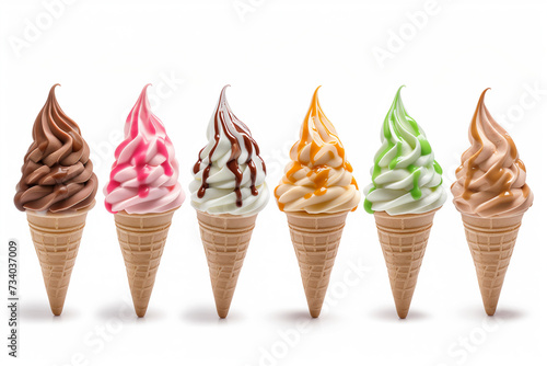 Row of different-flavored soft-serve ice cream cones with syrup on a white background