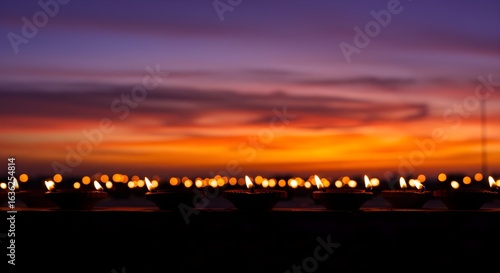 Row of Diwali oil lamps with glowing flames at sunset