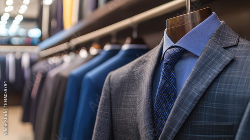 row of elegant business suits in various shades of blue and gray is displayed on hangers in modern clothing store, showcasing sophisticated and professional style