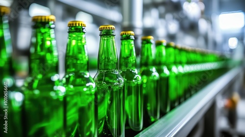 Row of Green Glass Beer Bottles on a Production Line in a Brewery