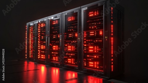 Row of illuminated server racks with red LED lights in a dark data center environment creating a futuristic and high-tech atmosphere