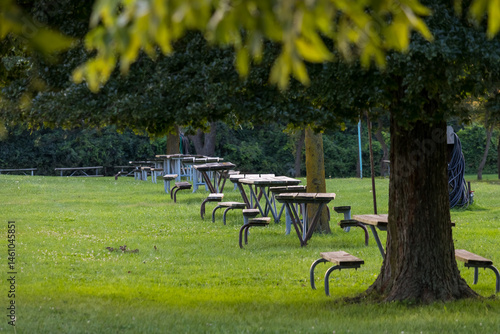 Row of picnic tables in the Livonia, Michigan state park during summer time.