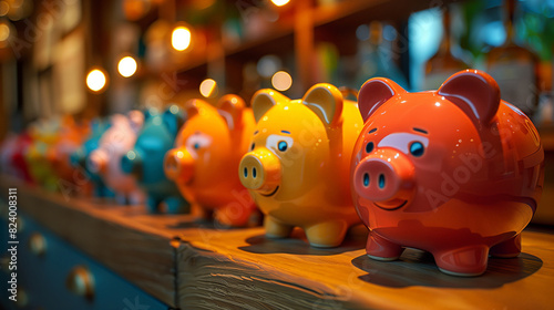 Row of piggy banks on wooden shelf, each unique design that reflects different savings goals