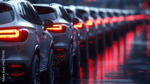 Row of silver cars with illuminated red tail lights lined up on a wet reflective surface creating a pattern of glowing red reflections and a sense of depth