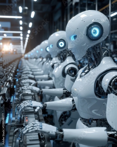 Rows of advanced humanoid like robots lined up in a high tech industrial manufacturing facility representing the automation and technological progress of modern production processes