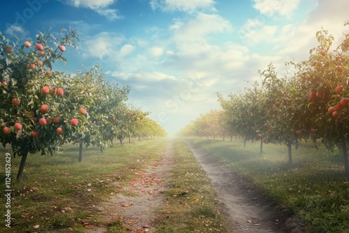 Rows of apple trees under a bright sky at dawn in a serene orchard landscape